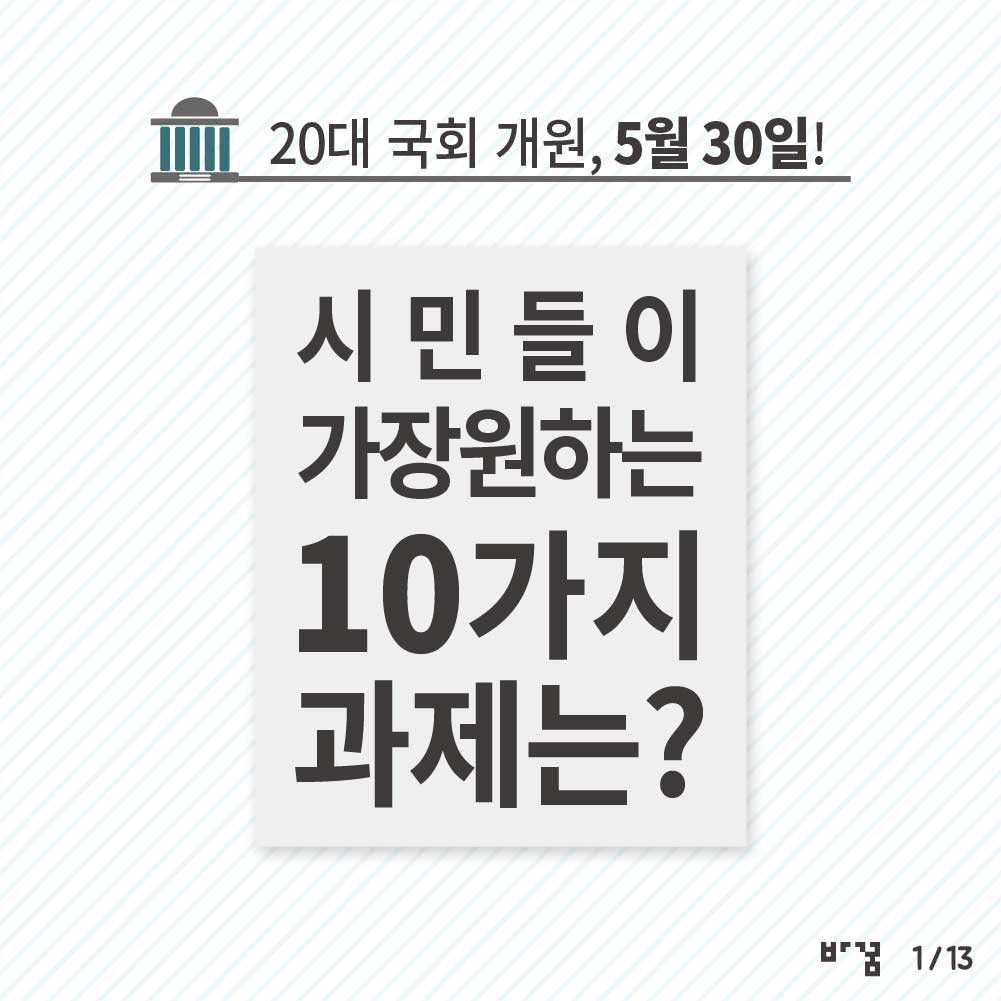 오는 30일, 20대 국회가 개원합니다. 17년만의 여소야대 정국. 국민들은 야당이 못 미덥지만 '헬조선' 한국사회의 수 많은 문제들을 청와대와 여당이 제대로 대처하지 못했다고 평가하고, 야당이 국회를 장악해서 주도적으로 해결해 보라고 기회를 준 것이지요. 심판 그 자체였던 20대 국회의 개원을 앞두고, 그럼 그 국민들이 지금 가장 원하는 10가지 정책과제를 정리해보았습니다. 2016총선시민네트워크와 바꿈, 세상을 바꾸는 꿈이 공동작업한 것으로 총선 직전인 4월 2일부터 5일까지 100명의 유권자 위원과 3,311명의 온라인투표 참여자들의 투표를 거쳐 선정한 Best 10 정책을 바탕으로 작성되었습니다.