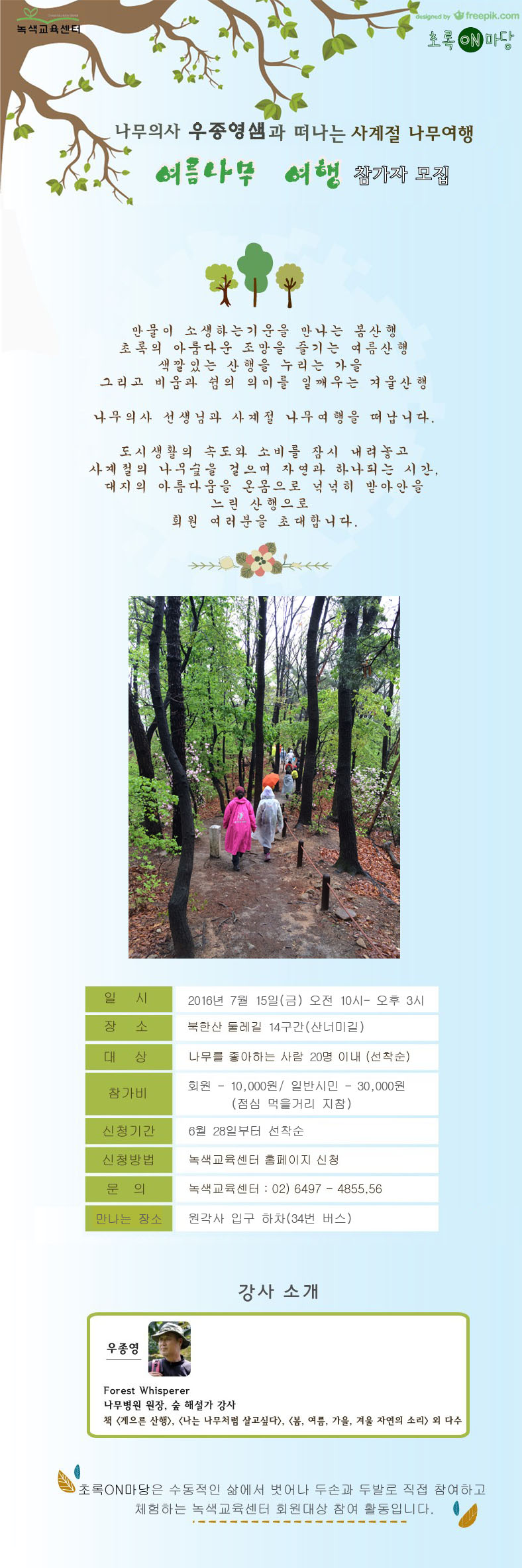 월, 2016/06/27- 17:16 에 익명 (미확인) 에 의해 제출됨 [0] 관련 개인/그룹 녹색연합 지역 성북구 나무의사 우종영선생님과 떠나는 여름나무 여행에서는 북한산 둘레길의 계곡길을 느리게 걸으며 초록의 아름다운 조망을 즐깁니다. 도시생활의 속도와 소비를 잠시 내려놓고... 링크 http://www.greenkorea.org/?p=54110 Tags 01활동 공지사항 나무여행 녹색교육센터 북한산 둘레길 우종영 Like 0 Dislike 0 482 views 댓글 달기 이름 제목 Comment 저장 Preview