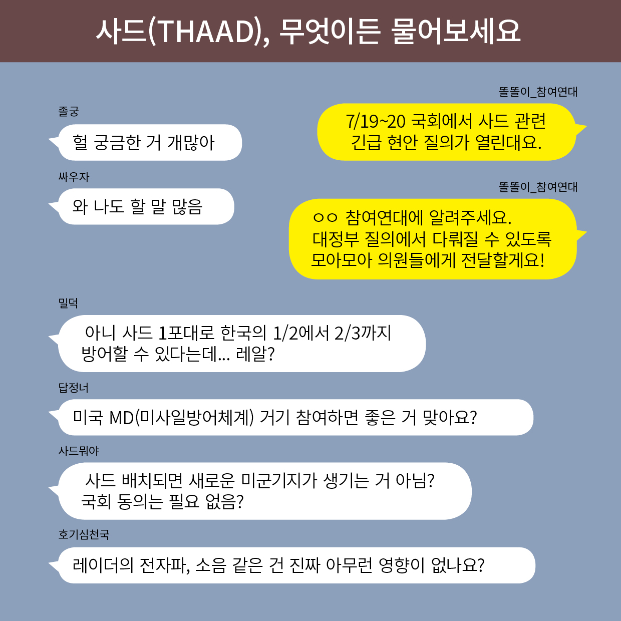 "왜 성주 시민 의견은 듣지도 않고 밀어붙이나? 사드 1포대로 한국의 1/2에서 2/3까지 방어할 수 있다는 거 사실임? 미국 MD(미사일방어체계) 참여하면 좋은 거 맞아? 새로운 미군기지가 생기는 건데 국회 동의는 필요 없나? 레이더의 전자파, 소음 같은 건 진짜 괜찮은 걸까?"