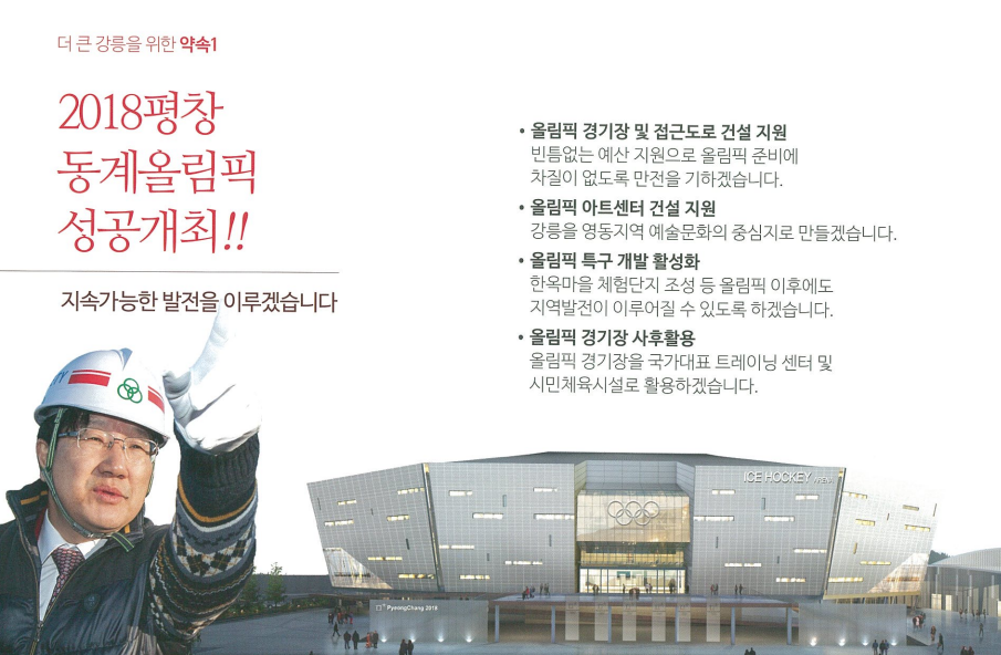 지역 강릉시 Tags 평창올림픽 출처 http://cpmadang.org/crawl/100119980.pdf 625 views 권성동 공약 1 - 2018평창 동계올림픽 성공개최!! - 올림픽 경기장 및 접근 도로 건설 지원 - 올림픽 아트센터 건설 지원 - 올림픽 특구 개발 활성화 - 올림픽 경기장 사후 활용