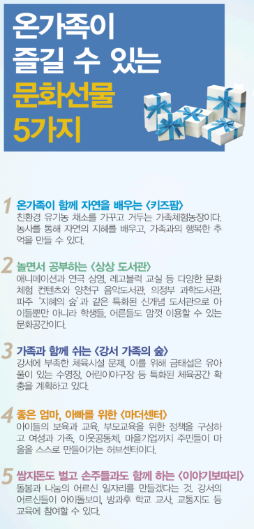 지역 강서구 Tags 마더센터 키즈팜 출처 http://cpmadang.org/crawl/100119795.pdf 627 views 금태섭 공약 - 온가족이 즐길 수 있는 문화선물 5가지 1, 온가족이 함께 자연을 배우는 <키즈팜> 2. 놀면서 공부하는 상상도서관 3. 가족과 함께 쉬는 강서 가족의 숲 4. 좋은 엄마, 아빠를 위한 <마더센터> 5. 쌈지돈도 벌고, 손주들과 함께 하는 <이야기보따리>