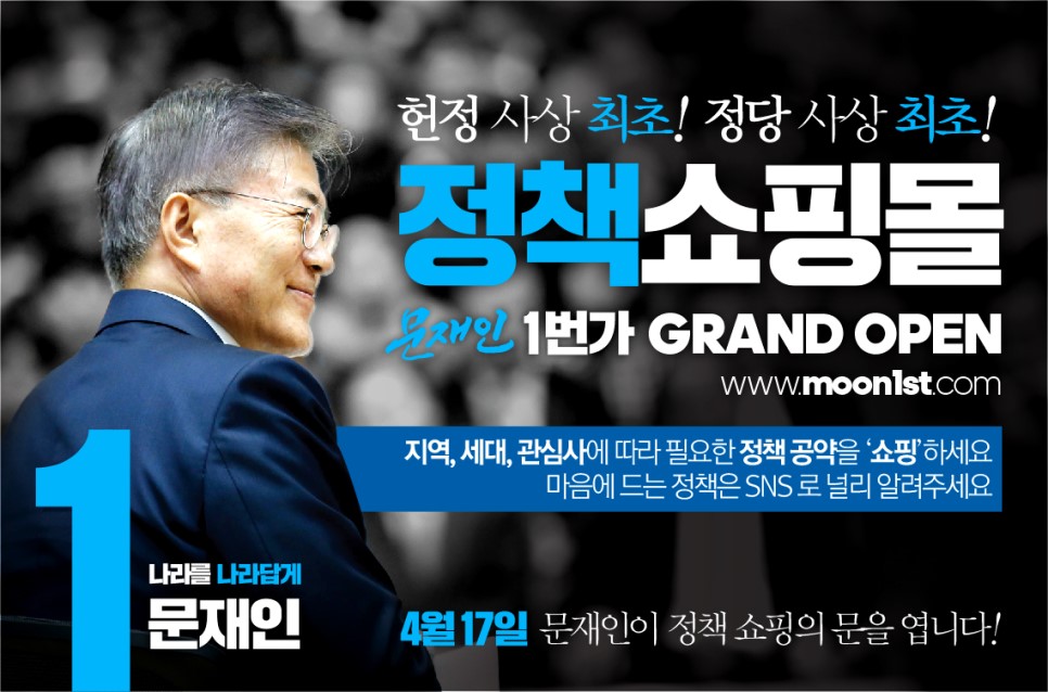 ■ 문재인 1번가, 매일매일 새롭게 국민들에게 접근하겠다 문재인 1번가가 개장을 하자마자 주문이 폭주하고 있다. 매일매일 따듯한 신상품 정책이 1번가에 업로드되고 있다. 오늘의 신상품은 ‘어르신 기초연금 30만원’ 정책이다. 문을 열자마자 주문이 폭주하고 있는 문재인 1번가에 오늘 어르신 기초연금 30만원 정책이 출시되었다. 문재인 후보는 오늘 65세 이상 어르신 70%에게 매월 차등 없이 기초연금 30만 원을 지급하기로 했다. 우리나라는 어르신 빈곤층이 2명 중 1명으로 세계 1위에 달하고 있다. 이와 함께 현재 70만 명에 이르는 치매환자도 앞으로 국가가 책임진다는 정책이 같이 나왔다. 틀니와 임플란트 본인부담금 역시 절반으.......