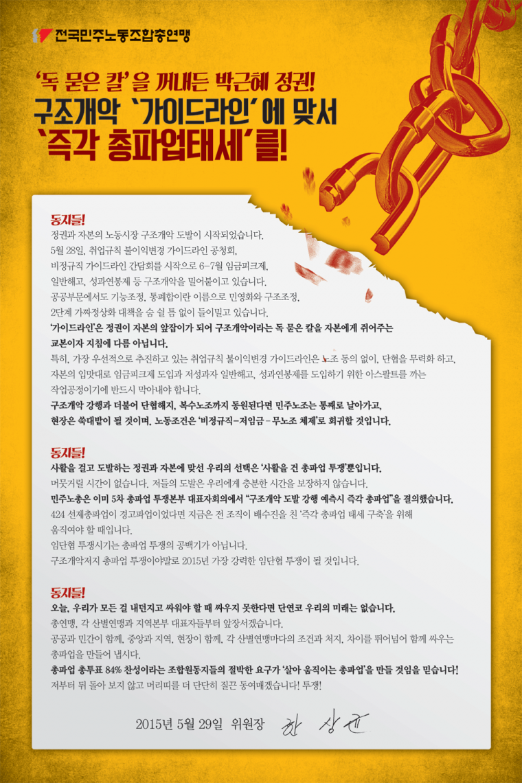 화, 2015/06/02- 15:31 에 익명 (미확인) 에 의해 제출됨 [0] 관련 개인/그룹 전국보건의료산업노동조합 지역 영등포구 민주노총 위원장 특별 담화문 포스터 링크 http://bogun.nodong.org/xe/index.php?document_srl=334161 Tags 임금피크제 비정규직 가이드라인 일반해고 성과연봉재 Like 0 Dislike 0 529 views 댓글 달기 이름 제목 Comment 저장 Preview