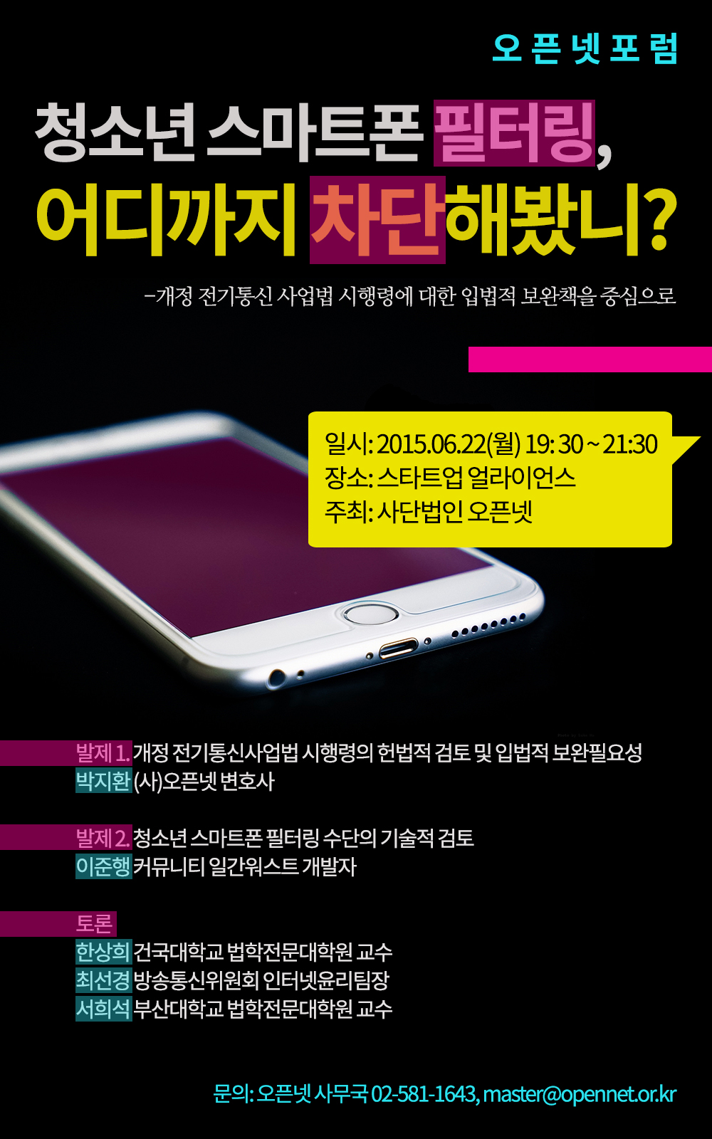 오픈넷, 6월 22일(월) “청소년 스마트폰 필터링 의무화”에 대한 포럼 개최