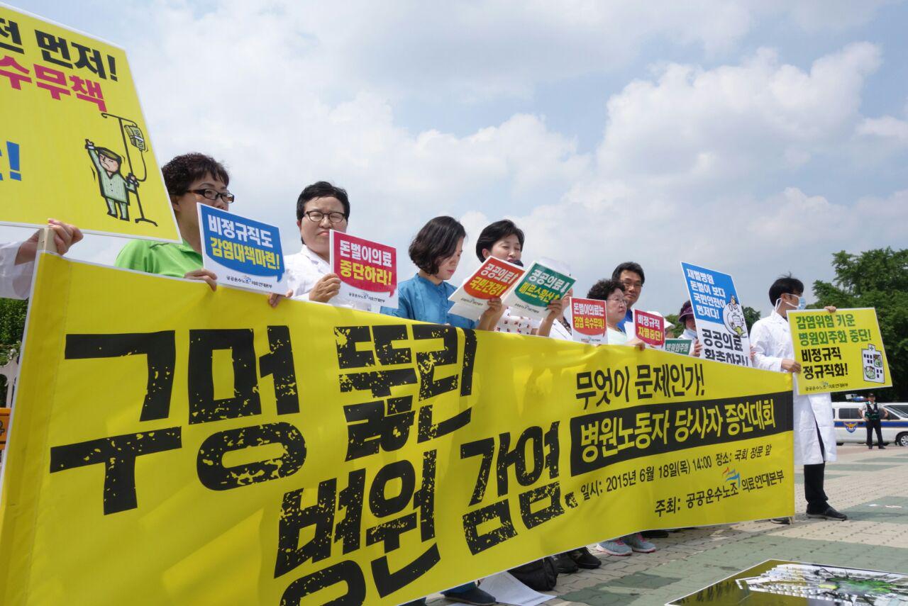 증언대회 참가자들은 " 국민들이 신종전염병으로 고통받고 죽어가는 지금 이 시간에도 새누리당과 정부는 원격의료가 필요하다며 의료민영화를 들먹이고 있다. 지금 이 순간에도 병원자본은 외주하청화를 추진하고 있다. 현대자본의 울산대병원은 경비절감을 위해 권역별 응급센터 안전요원을 외주하청화 시키고 있다. "고 폭로했다.