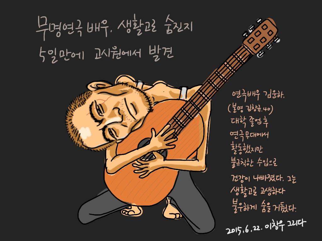 월, 2015/06/22- 02:38 에 admin 에 의해 제출됨 [0] 연극배우 김운하 (본명 김창규 40) 대학 졸업 후 연극무대에서 활동했지만 불규칙한 수입으로 건강이 나빠졌다. 그는 생활고로 고생하다 불우하게 숨을 거뒀다. 수취인 불명 무명배우 고 김운하님께. 하늘나라에서는 마음껏 연기도 하고 노래도 부르세요. ㅠㅠ 링크 https://www.facebook.com/photo.php?fbid=991687504204758&set=a.213057775401072.58090.100000905531248&type=1&theater= Tags 가난 가난죽음 Like 0 Dislike 0 965 views 댓글 달기 이름 제목 Comment 저장 Preview