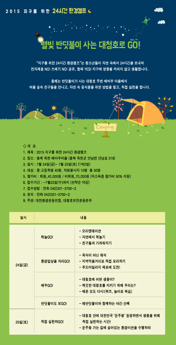화, 2015/06/23- 17:06 에 익명 (미확인) 에 의해 제출됨 [0] 관련 개인/그룹 대전환경운동연합 지역 대전 서구 2015 지구를 위한 24시간 환경캠프 충북 옥천 베바우마을 ( 충북 옥천군 안남면 안남로 519) 7월 24일 ~ 7월 25일 참가 신청 7월 22일까지 (선착순) 이라 합니다. 대전환경운동연합 / 대청호보전운동본부.. 링크 http://daejeon.ekfem.or.kr/archives/18648 Tags 350 캠페인 활동마당 회원마당 캠프 Like 0 Dislike 0 583 views 댓글 달기 이름 제목 Comment 저장 Preview