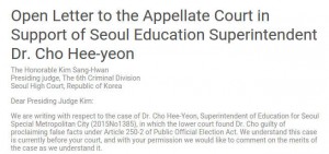 Open Letter to the Appellate Court in Support of Seoul Education Superintendent Dr. Cho Hee-yeon