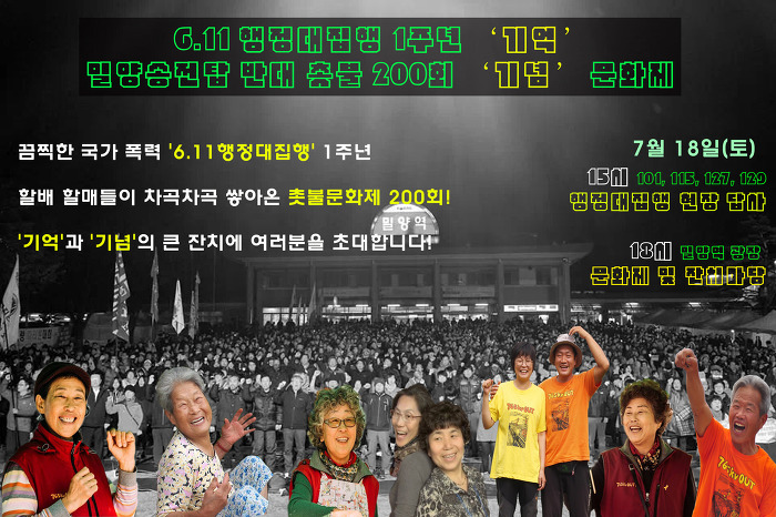 ‘6.11 행정대집행’ 1주년과 ‘밀양송전탑반대 촛불문화제 200회’를 맞아 밀양 어르신들과 함께 ‘기억’과 ‘기념’의 자리를 마련했습니다.