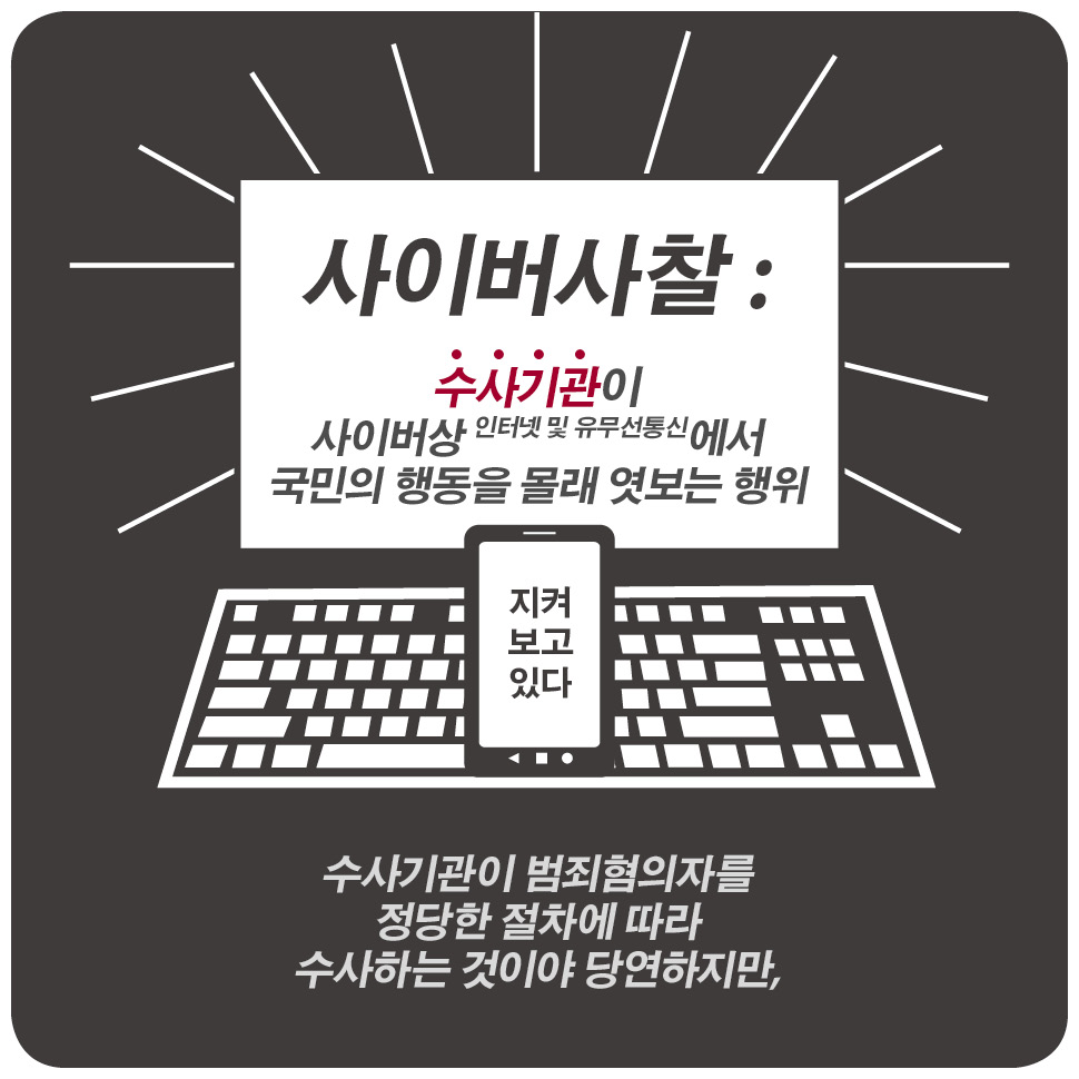 사이버사찰 : 수사기관이 사이버상(인터넷 및 유무선통신)에서 국민의 행동을 몰래 엿보는 행위