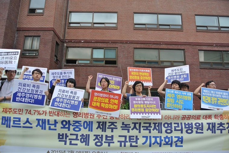 메르스 사태가 정점이던 6월 15일 녹지그룹이 제출한 제주영리병원 설립계획서가 보건복지부에 접수되었다. 국민의 불안과 염려가 최고로 높았던 그때 국민 안전에 손을 놓고 있던 박근혜 정부는 영리병원 추진을 다시 시작하고 있었던 것이다.