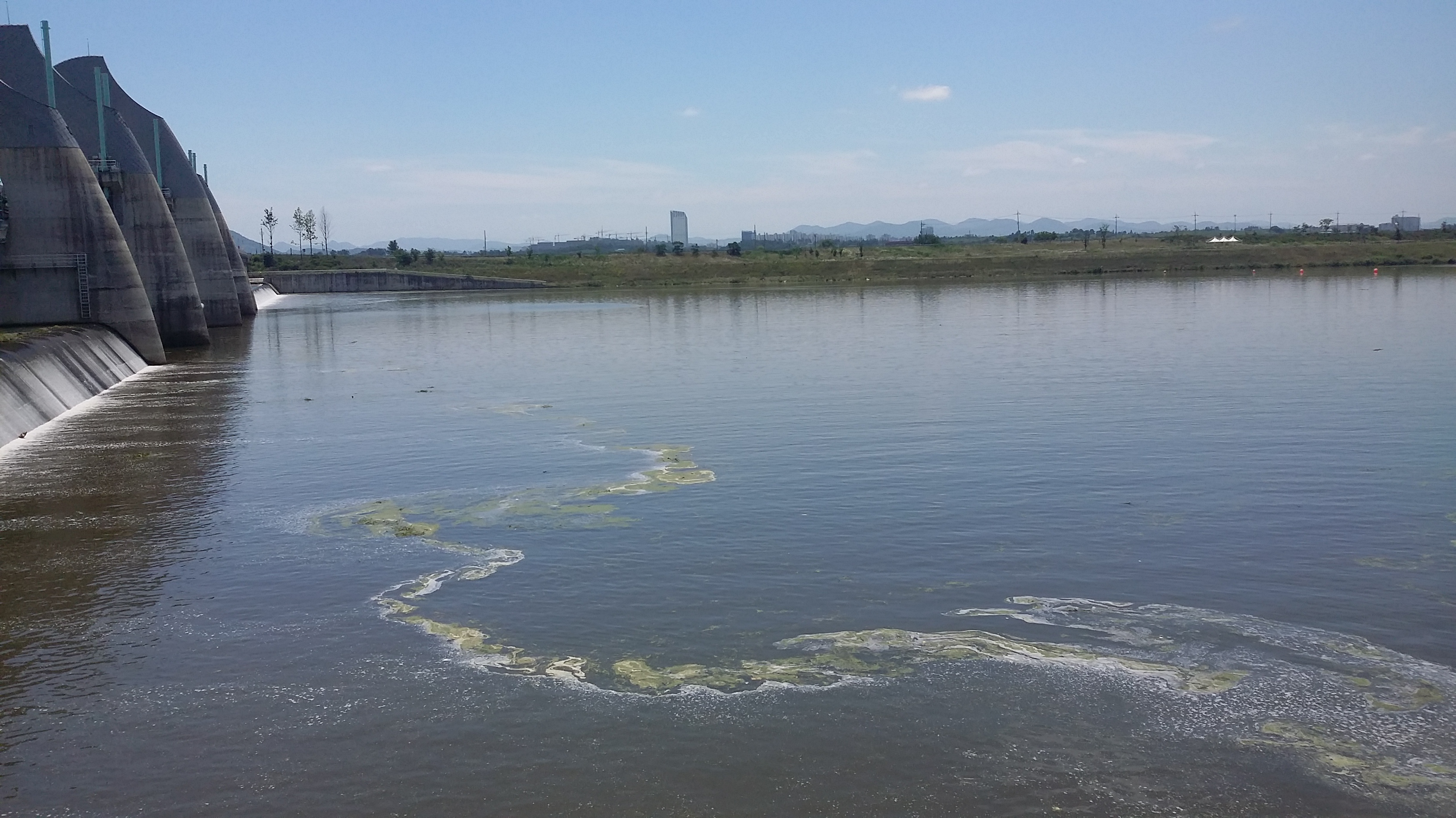 비가 온 다음 날이라서 영산강에 녹조와 큰빗이끼벌레 등이 많이 보이지는 않았습니다. 우리나라의 하천에는 보, 댐과 같은 하천 구조물이 평균 3.6km마다 하나씩 자리 잡고 있습니다. 곳곳에 4대강의 흔적들이 자리 잡고 있습니다. 영산강의 수질이 좋지 않은 근본적인 이유는 4대강사업의 부작용 때문이지만 근처에 대도시인 광주가 있는 것도 하나의 원인이라고 할 수 있습니다.