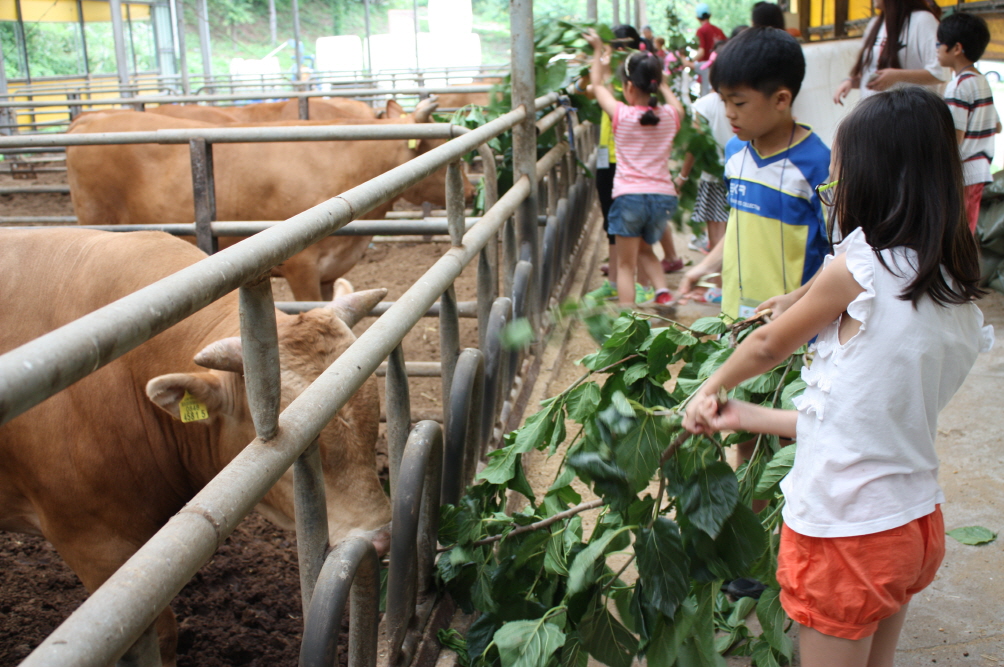 아이들이 소에게 열심히 뽕나무 잎을 먹여주는 모습입니다^.^