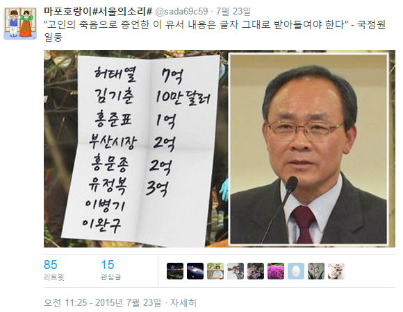 금, 2015/07/24- 15:25 에 admin 에 의해 제출됨 [0] 성완종 리스트 - "고인의 죽음으로 증언한 이 유서 내용은 글자 그대로 받아들여야 한다" - 국정원일동 링크 https://twitter.com/sada69c59/status/624042726724517888 Tags 성완종 성완종 리스트 유머 국정원 해킹 Like 0 Dislike 0 762 views 댓글 달기 이름 제목 Comment 저장 Preview