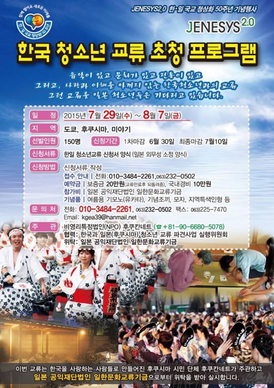 전주 지역 청소년들이 주축이 된 한일청소년문화교류단 170명이 한일수교50주년을 기념하기 위해 일본 외무성(JENESYS2.0" 프로젝트) 후원으로 후쿠시마를 방문한다.