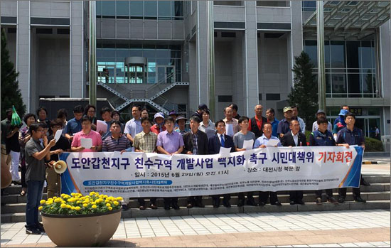 대전 <도안 갑천지구 친수구역 개발사업> 백지화 시민대책위(이하 대책위)는 지난 6월 29일 진행된 기자회견을 통해 재정파탄, 환경파괴, 동서 격차 심화 등 <도안 갑천지구 친수구역 개발사업>의 여러 문제를 제기하고 사업 중단을 요구하였다. 또한 해당 적절한 보상을 요구하는 주민들과 대책위는 대전시청 앞에서 <도안 갑천지구 친수구역 개발사업>의 백지화를 요구하며 농성을 이어가고 있다. 그럼에도 불구하고 대전시는 <도안 갑천지구 친수구역 개발사업>을 밀어붙이려 하고 있다.