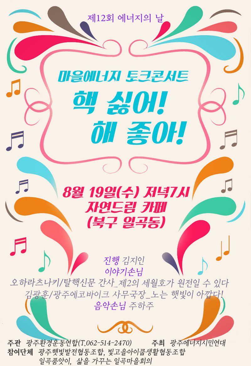 금, 2015/08/07- 18:30 에 익명 (미확인) 에 의해 제출됨 [0] 관련 개인/그룹 광주환경운동연합 지역 광주 북구 에너지의 날을 맞이하여 준비한 ‘마을에너지 토크콘서트’ 마을에서 에너지를 이야기하고, 고민하고, 실천하자!! 토크콘서트에 핵보다 해를 좋아하는 회원님을 초대합니다*^0^* 링크 http://gj.ekfem.or.kr/archives/8513 Tags 공지사항 알림마당 토크콘서트 탈핵 에너지의 날 광주에너지시민연대 Like 0 Dislike 0 1095 views 댓글 달기 이름 제목 Comment 저장 Preview