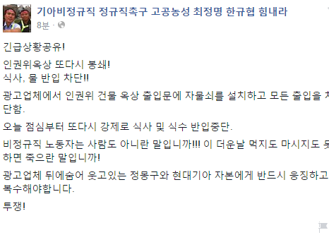월, 2015/08/10- 17:41 에 admin 에 의해 제출됨 [0] 지역 종로구 긴급상황공유! 인권위옥상 또다시 봉쇄! 식사, 물 반입 차단!! 광고업체에서 인권위 건물 옥상 출입문에 자물쇠를 설치하고 모든 출입을 차단함. 오늘 점심부터 또다시 강제로 식사 및 식수 반입중단. 비정규직 노동자는 사람도 아니란 말입니까!!! 이 더운날 먹지도 마시지도 못하면 죽으란 말입니까! 광고업체 뒤에숨어 웃고있는 정몽구와 현대기아 자본에게 반드시 응징하고 복수해야합니다. 투쟁! https://www.facebook.com/kiaskyfighting?fref=nf 링크 https://www.facebook.com/kiaskyfighting?fref=nf Tags 기아차 고공농성 기아차 기아차 비정규직 고공농성 Like 0 Dislike 0 1817 views 댓글 달기 이름 제목 Comment 저장 Preview