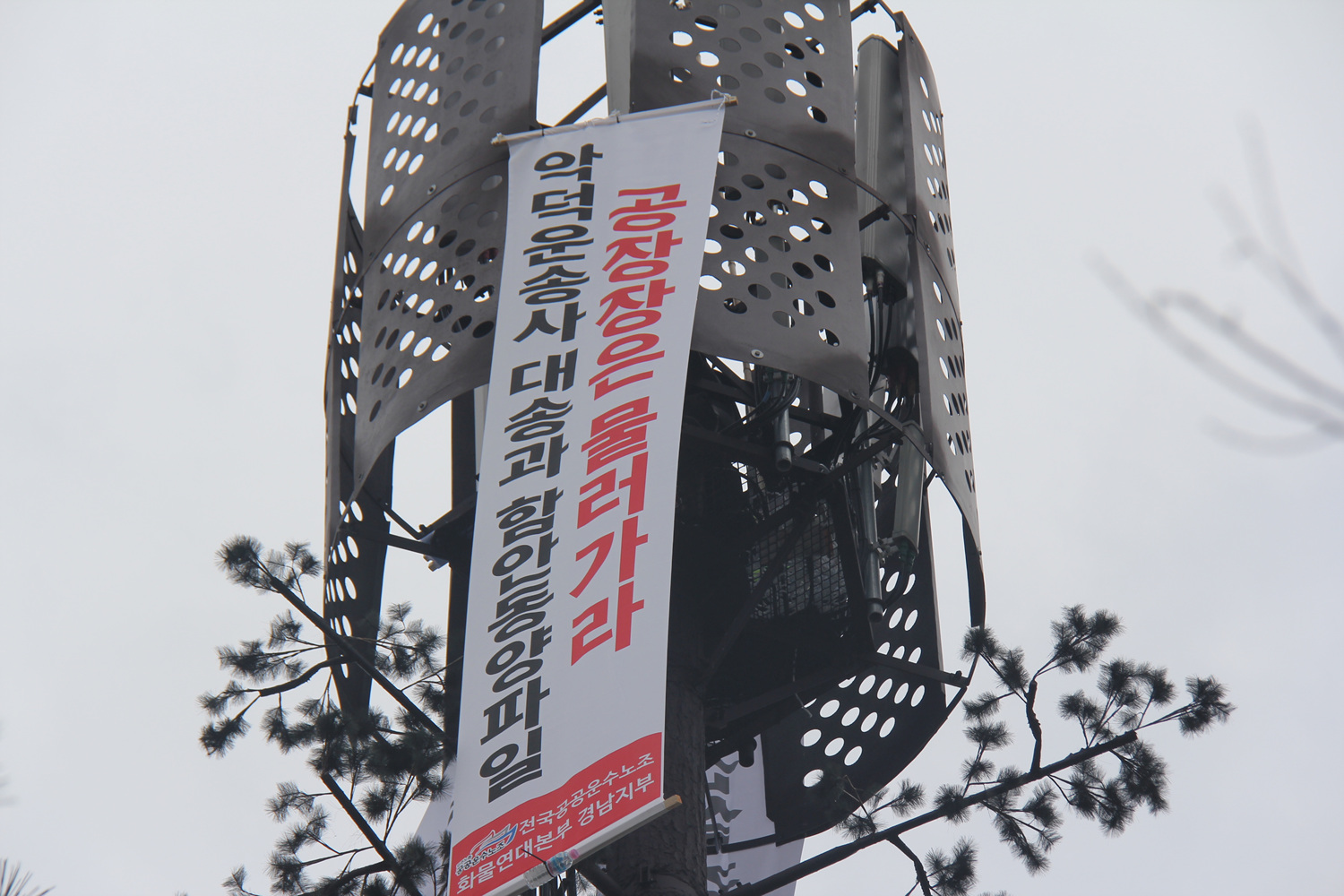 물연대본부 동양파일분회 조합원들이 사측의 일방적 계약해지에 맞서 투쟁을 전개하고 있는 가운데 지난 8월 10일 백문흠, 김철규 두 조합원이 창원 용지문화공원내의 20m 높이의 송신탑에서 고공농성에 돌입했다.