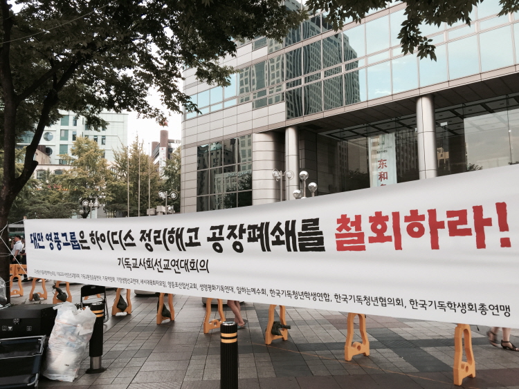 현대전자에서 분리되어 나온 하이디스는 최근 대만자본인 이잉크가 불법으로 직장폐쇄를 선언함으로 대량해고를 당하게 되었습니다. 해고된 노동자들은 지난 1월부터 본격적으로 농성에 들어갔고, 지난 5월 배재형 전 지부장이 희생된 이후로 79일째 광화문 농성장을 지키고 있습니다. 또한 하이디스 노동자들은 이잉크가 있는 대만까지 원정투쟁을 진행하고 있는데, 현재는 5차 원정단이 이잉크 본사 앞에서 농성을 진행하고 있습니다.
