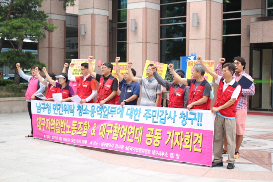 그기다가 노동조합에 가입했다는 이유로 가입한지 한달여만에 조합원 5명 중에 3명을 해고시켰습니다. 정부지침으로 간접고용노동자의 고용을 보장해야 함에도 환경미화원을 1회용 종이컵처럼 생각하는 진솔환경에 대해서 남구청에 수없이 시정조치를 요구했으나 2달이 지난 지금까지 남구청은 아무것도 하지 않고 있습니다. 이에 도저히 참을 수 없어서 대구지역일반노동조합과 대구참여연대가 공동으로 대구시에 주민감사를 청구하게 되었습니다.