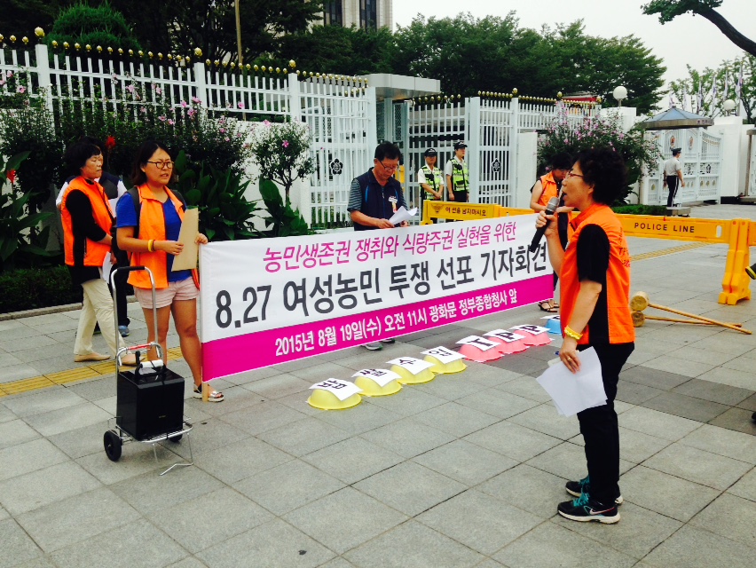 환경정의 먹거리 팀은 19일 <농민 생존권 쟁취와 식량주권 실현을 위한 8.27 여성농민 투쟁 선포 기자회견>에 참석하였습니다. 이 자리는 전국의 여성농민들이 농민 생존권 쟁취, 식량주권 실현을 위한 8.27 전국여성농민 결의대회에 앞서 진행된 기자회견입니다. 여성농민들은 1) 명분 없는 밥 쌀용 쌀 수입, 쌀 전면 개방 반대 2) TPP가입 추진 반대 3) 중국, 뉴질랜드, 베트남과의 FTA 국회 비준 저지 4) 공동 경영주 실현과 행복 바우처 확대 실시 5) 기초농산물 국가 수매제 실시 6) 세월호 인양, 진상 규명과 책임자 처벌 7) 주한미군 탄저균 불법 반입과 훈련 반대, 진상 규명을 구호로 삼았습니다.