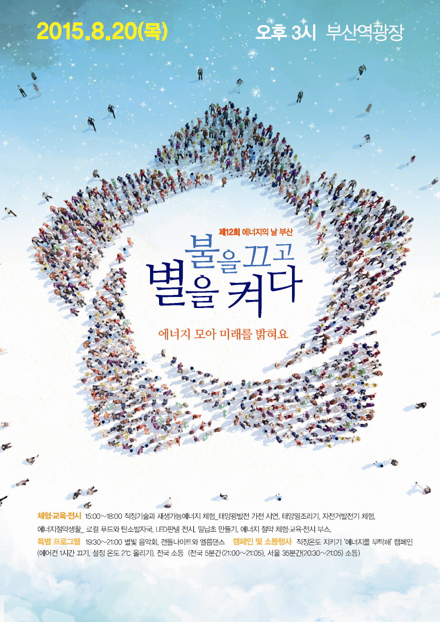 ○ 올해 행사는 8월 20일, ‘에너지 모아 미래를 밝혀요’라는 슬로건으로 서울광장을 비롯한 전국 15개 도시에서 개최됩니다. 부산에서는 이날 부산역광장에서 오후3시부터 9시 10분까지 에너지절약과 전환을 위한 홍보, 교육, 전시, 체험 마당을 펼칩니다.