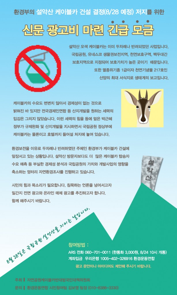 금, 2015/08/21- 18:38 에 익명 (미확인) 에 의해 제출됨 [0] 관련 개인/그룹 환경운동연합 지역 종로구 링크 http://kfem.or.kr/?p=152666 Tags 공지사항 설악산 케이블카 신문광고 Like 0 Dislike 0 762 views 댓글 달기 이름 제목 Comment 저장 Preview