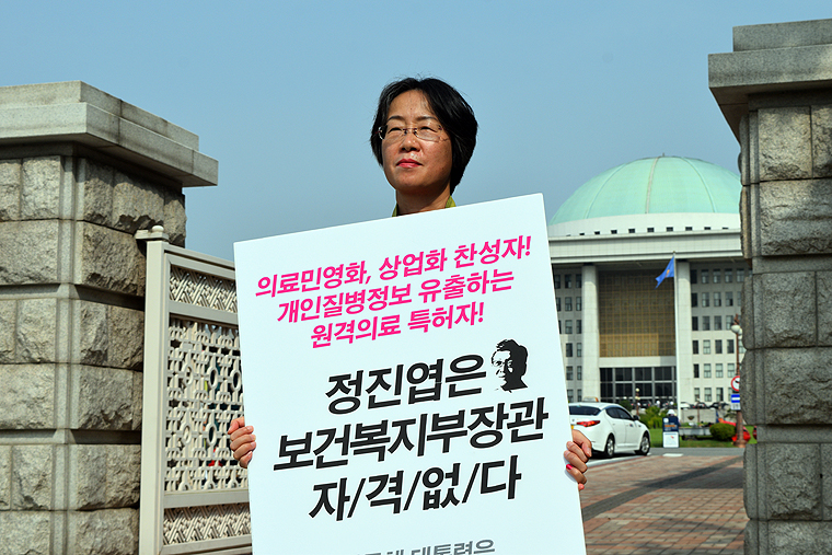 보건의료노조는 8월 24일 오전 9시반부터 오후 1시 30분까지 국회 앞에서 정진엽 보건복지부 장관 내정자의 내정 철회를 촉구하는 1인시위를 진행했다. 정진엽 내정자는 교수시절부터 적극적으로 원격의료와 의료민영화 찬성 의혹을 받고 있다. 특히 시위가 진행된 24일은 국회에서 정진엽 내정자에 대한 인사청문회가 시작되어 정진엽 내정자의 입장표명에 여론이 집중되고 있다.