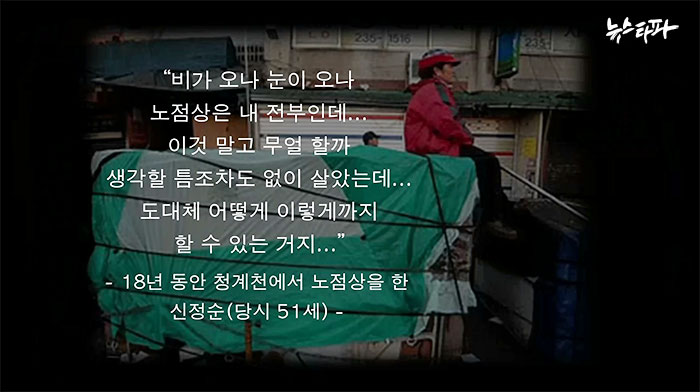 하지만 그 과정에서 수많은 청계천 노점상들은 생계의 터전을 잃게 됩니다. 이곳저곳을 떠돌게 되고 그 과정에서 많은 노점상들이 스스로 목숨을 끊는 일이 벌어집니다. 그리고 그 고통은 현재 진행형이기도 합니다. 얼마 전 성동공고 뒤편에 자리 잡았던 청계천 노점상들은 강제 철거로 집기류를 모조리 압수당했습니다.