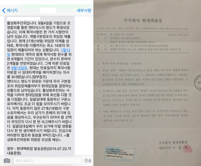 이 메세지와 공문에 따르면 '개별구분점포의 위임장 제출이 현대백화점 측이 요청한 특약 사항이며 아직 19명이 위임장을 제출하지 않은 것'으로 나타났다. 그런데 현대백화점 측은 9월 15일까지 이들의 위임장이 징구되지 않으면 입점 계획을 해지하겠다고 밝힌 것이다.