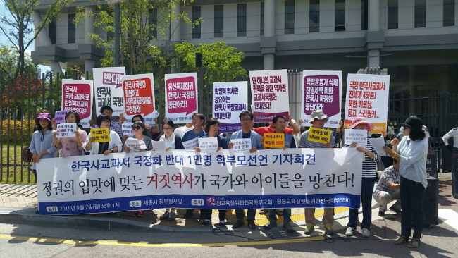 우리는 지난 2013년 우리 사회를 떠들썩하게 했던 교학사 교과서 파동을 겪으면서 학부모들로서 아이들이 배울 역사에 대해 깊은 관심을 가져야 함을 깨달았다. 다행히도 교학사 교과서를 채택한 학교가 거의 없어 한숨 놓았다 싶었는데 정치권과 교육부에서 역사교과서를 국정화하겠다고 하면서 9월말 고시를 앞두고 있다. 이에 우리 학부모는 정권의 입맛에 맞는 거짓된 역사를 우리아이들이 배우게 내버려둘 수 없고, 역사 앞에 부끄럽지 않은 부모가 되기 위해 오늘 학부모1만3천여 명(6일 5시 기준)을 대표하여 역사교과서 국정화 반대를 위해 이 자리에 섰다.
