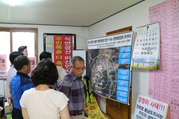 마을회관을 먼저 방문했다, 주민들이 많이 모여 있었는데, 이 날은 대전지방법원에서 폐기물매립장건설반대 관련한 5차 재판이 있는 날이기 때문이었다. 마을회관은 흡사 지휘본부 같았다. 현수막은 말할 것도 없고, 거실과 부엌 벽에는 지도와 그간 활동해 온 사진, 대자보, 일지까지 언제든 볼 수 있게 배치되어 있었다.