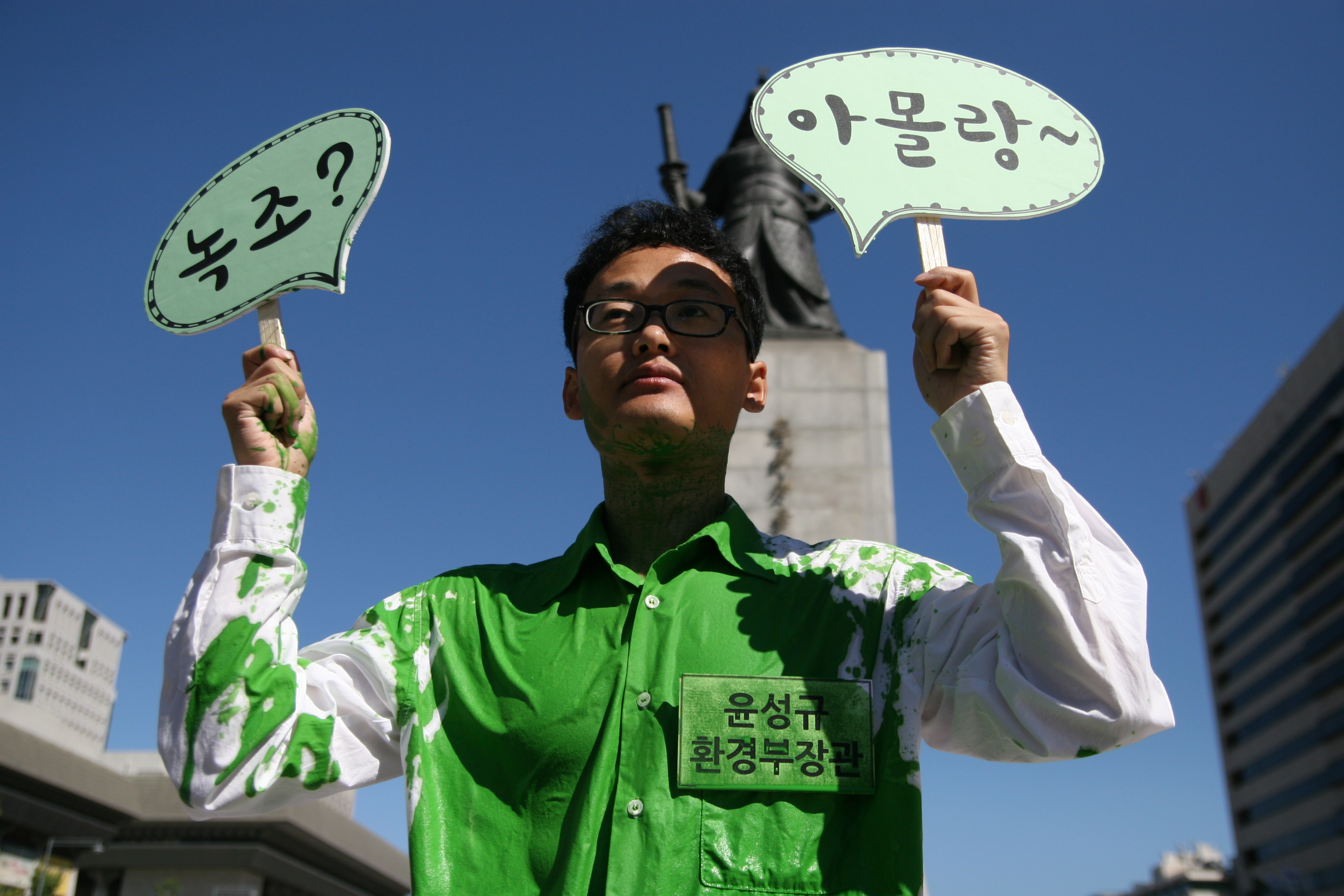 ◯ 최지현 광주환경운동연합 사무처장은 “환경부의 무관심과 무대책이 결국 이러한 녹조 사태를 초래했다고 밖에 볼 수 없다”며 “환경부와 정부가 녹조 발생에 대한 아무런 대책도 없이 방관하는 이유는 다름 아니라, 녹조 발생이 4대강의 보 때문임을 너무나 잘 알고 있기 때문”이라며 “농어민의 생계 대책을 마련하고 수문을 개방할 것”을 요구했다. ◯ 이날 기자회견의 퍼포먼스는 4대강의 녹조를 상징하는 녹조물을 윤성규 환경부 장관에게 선사하는 것으로 끝을 맺었다. 윤성규 환경부 장관으로 분한 활동가의 하얀 셔츠에 녹조물을 손바닥으로 찍고 뿌리기도 하면서 녹조사태를 초래한 환경부 장관에게 퇴진을 요구하는 퍼포먼스를 보여줬다.