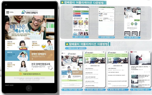 [장애인 참배움터]에서는 교육소외계층의 사각지대에 놓인 성인중증장애인의 시·공간적 한계를 초월한 학습 환경을 제공하기 위해 ‘성인장애인 교육자료 온라인 보급 시스템’을 구축하는 사업을 진행하였습니다. 현장 자원봉사자 교사 자원을 활용하여 수업 영상 및 앱을 제작, 블로그 및 앱을 통해 무료보급을 진행하고 있습니다.