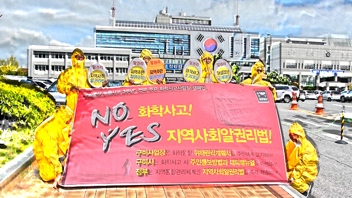 세계 유사 화학사고의 교훈은, 정부와 사업장의 노력만으로 화학사고를 막기 어렵다는 것입니다. 가장 중요한 것은 어느 지역장소, 어느 사업장에 어떤 종류의 위험물질이 얼마만큼 취급되고 있고 얼마나 위험한지, 사고 시에는 어떤 대응매뉴얼에 따라 대피해야 하는지를 누구나 알고 싶을 때 알아야 한다는 것입니다.