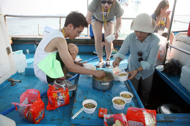 돌아오는 배에서는 선창에서 모둠교사 선생님들의 지도하에 안전하게 '꽃게라면'을 먹었습니다.