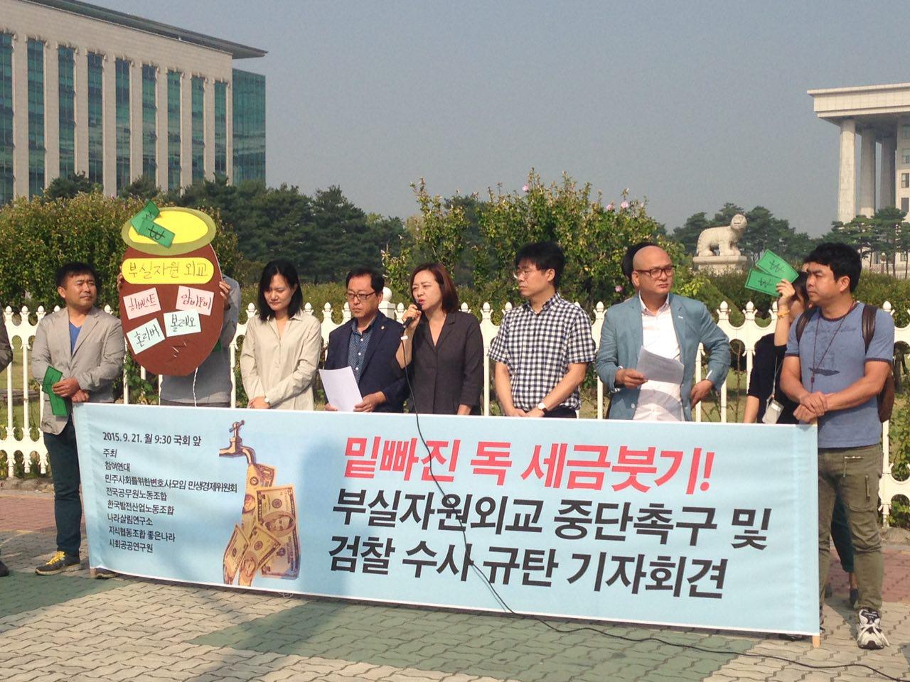 - 지난 17일, 자원외교 비리수사가 7개월 만에 종결되었습니다. 일부 공기업 사장들에게 배임혐의만 적용, 자원외교에 얽힌 구조적인 유착과 비리 의혹은 고스란히 남긴 검찰의 부실 수사에 대한 실망과 분노, 이를 규탄하기 위해 시민사회가 한 자리에 모였습니다.