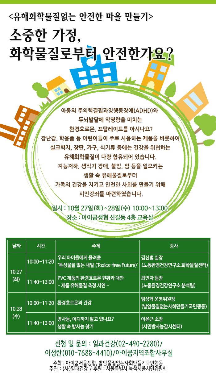 월, 2015/09/28- 16:34 에 익명 (미확인) 에 의해 제출됨 [0] 관련 개인/그룹 일과 건강 지역 중랑구 화학물질 안전 강의 - [10/27~28, 영등포구] 소중한 가정, 화학물질로부터 안전한가요? 링크 http://safedu.org/94913 Tags 가정 toxic 김신범 최인자 임상혁 이윤근 ADHD 방사능 환경호르몬 PVC Like 0 Dislike 0 778 views 댓글 달기 이름 제목 Comment 저장 Preview