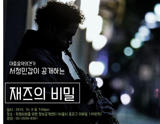 정보공개센터의 후원회원이자 대중음악의견가이신 서정민갑님의 강연이 10월 8일 목요일 저녁 7시 정보공개센터 사무실에서 진행됩니다. 서정민갑님은 대중음악의견가로 활동하고 각종 공연과 페스티벌 기획자이시기도 하지요. 최근에는 [대중음악 히치하이킹하기]라는 책을 쓰시기도 했구요.