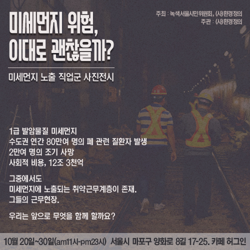 2015년 환경정의는 미세먼지에 취약한 근무자와 근무현장을 사진으로 담아보았습니다. 카페 허그인에서 2주에 걸쳐 진행하는 상시전시에 많은 관심 부탁드립니다.