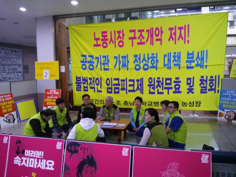 교육부가 11월 2일 전까지 국립대병원에 임금피크제를 도입하라는 지침을 내리는 등 정부는 불법을 자행하면서까지 국립대병원 임금피크제 도입을 강행하고 있다. 경상대병원, 전남대병원, 전북대병원, 부산대병원, 충남대병원, 충북대병원 등 국립대병원들이 11월 2일 임금피크제 도입을 위한 서면이사회를 개최했거나 개최를 추진했다.