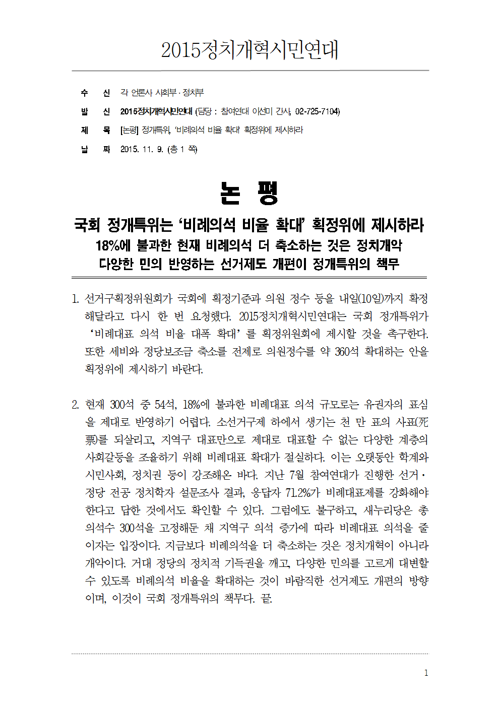 1. 선거구획정위원회가 국회에 획정기준과 의원 정수 등을 내일(10일)까지 확정해달라고 다시 한 번 요청했다. 2015정치개혁시민연대는 국회 정개특위가 ‘비례대표 의석 비율 대폭 확대’를 획정위원회에 제시할 것을 촉구한다. 또한 세비와 정당보조금 축소를 전제로 의원정수를 약 360석 확대하는 안을 획정위에 제시하기 바란다.