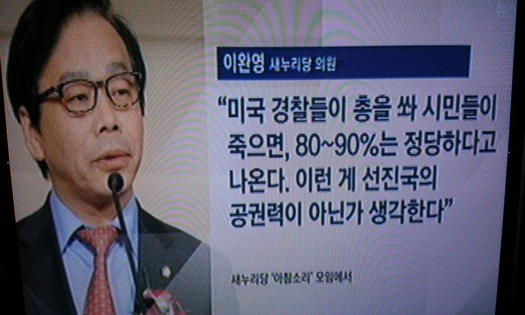 월, 2015/11/16- 13:51 에 익명 (미확인) 에 의해 제출됨 지역 고령군성주군칠곡군 이완영(李完永) 20대 국회의원 지역 고령군성주군칠곡군 국회의원 선거구 경상북도/고령군성주군칠곡군 정당 새누리당 신분 국회의원 Tags 환경연합선정 낙천인사 4대강 옹호의원 416연대 심판명단 [0] 도시 경상북도 지역구 고령군성주군칠곡군 새누리당 이완영 의원(58·사진)이 16일 “최근 미국에서 경찰들이 총을 쏴서 시민들이 죽는데 10건에서 80~90%는 정당하다고 나온다”며 “아마 이런것들이 저는 그게 선진국의 공권력이 아닌가 (생각한다)”고 밝혔다. 이 의원은 이날 새누리당 초·재선 모임인 아침소리에서 지난 14일 서울 광화문 광장 등에서 진행된 민중총궐기 집회를 비판하며 이같이 밝혔다. Tags 11.14일 집회 민중총궐기 국회의원 망언 망언 국회의원 막말 출처 http://news.khan.co.kr/kh_news/khan_art_view.html?artid=201511161125491 Like 0 Dislike 0 1342 views
