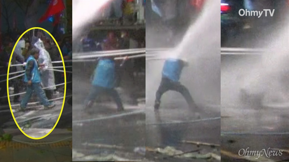 차벽과 4m 정도 떨어져 서 있던 백씨는 강한 수압의 물대포를 머리에 집중적으로 맞고 힘없이 도로에 쓰러집니다.