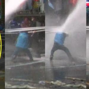 백씨가 차벽에 연결된 줄을 당기기 시작하자 경찰이 물대포를 조준사격합니다.