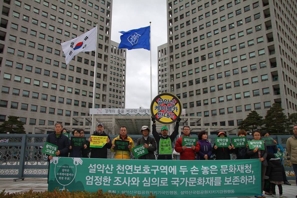 지난 18일 설악산국립공원지키기 국민행동과 강원행동은 대전 문화재청 앞에서 기자회견을 진행했습니다[/caption] 설악산 천연보호구역 두 손 놓은 문화재청, 엄정한 조사와 심의로 케이블카로부터 국가문화재를 보존하라 설악산국립공원지키기국민행동과 강원행동은 지난 18일 오전 문화재청 앞 기자회견을 통해 "문화재청이 지금이라도 국가 문화재를 지키고 보호하겠다는 의지를 보여주려면, 무엇보다 공정하고 엄정하게 오색 케이블카를 심의해야 한다"며 올바른 심의를 요구했습니다. 설악산 천연보호구역에 대한 조사, 연구, 관리가 제대로 수행되지 않았음이 밝혀진 이상, 이제라도 문화재청 차원에서 설악산에 대한 전반적인 조사가 진행되어야 합니다. 설악산국립공원지키기 국민행동과 강원행동은 "공정한 심의를 위해서, 문화재청과 문화재위원회는 환경단체가 참여한 공동조사를 실시할 것을 요구"하며, "특정 분야에 국한한 것이 아니라 동물, 식물, 경관, 지질 등 전반적인 설악산의 자연환경 정밀조사가 이뤄질 것"을 요구했습니다.