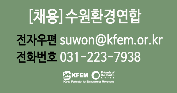 수원환경운동연합은 지속가능한 사회를 지향합니다. 생명·평화·공존을 가치를 실현하기 위해 기후변화대응, 탈핵·에너지전환, 환경정책, 환경교육, 자연생태 보존 활동과 지역사회 연대활동을 펼치고 있습니다. 생명에 대한 애정과 시민사회운동에 대한 열정을 가진 분을 기다립니다.