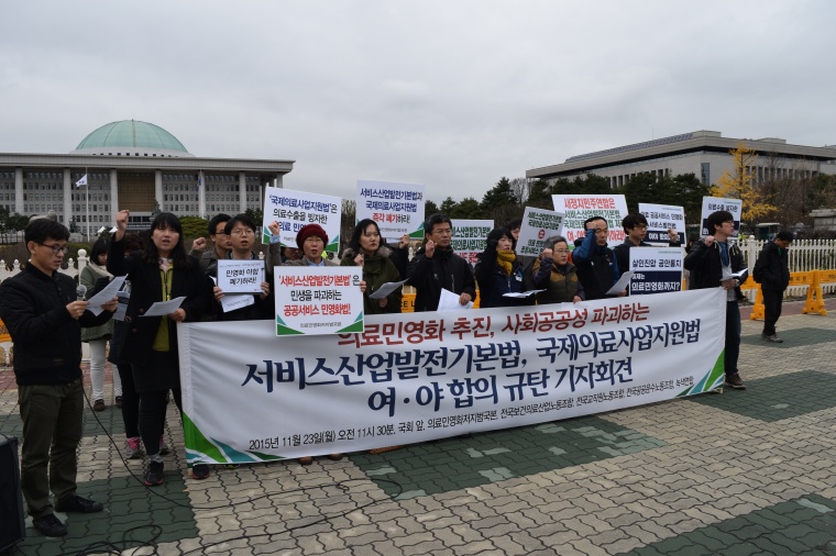 보건의료노조, 의료민영화저지범국본, 전국공공운수노조, 전국교직원노조, 녹색연합은 11월 23일 오전 11시 30분 국회 앞에서 기자회견을 열고 의료 민영화를 추진하고 사회공공성을 파괴하는 ‘서비스산업발전기본법’, ‘국제의료사업지원법’의 여야 합의를 규탄하고 두 악법의 저지 투쟁의 결의를 밝혔다.