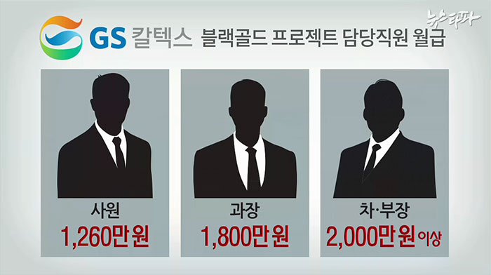 반면 블랙골드 건설 담당 GS건설 직원들에겐 억대 연봉이 책정됐다. 가장 직급이 낮은 사원이 매달 11,000 달러를 받았다. 당시 환율로 계산하면 1,260만원으로 2012년 당시 석유공사 대졸 초임 연봉의 6배에 해당된다. 과장은 1,800만원, 차장 이상은 매달 2000만 원이 넘게 받았다.